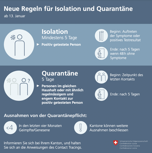 Isolation und Quarantäne sind Massnahmen um die Infektionsketten zu unterbrechen und so die Weiterverbreitung des Coronavirus einzudämmen erläutert das. Der Bundesrat hat verkürzte Quarantäne-Regeln beschlossen. Oft sind die Ämter jedoch überlastet.